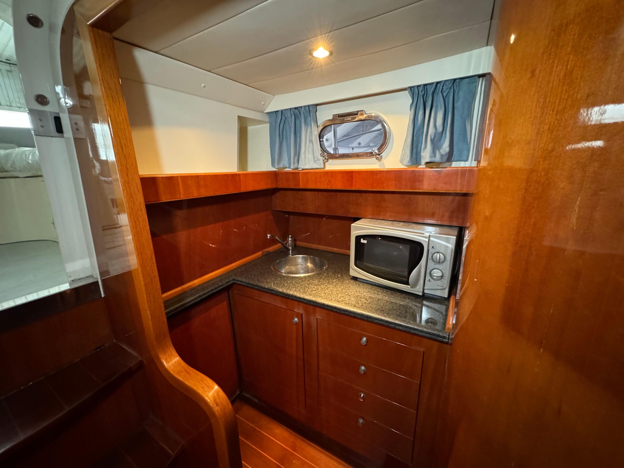 - Küche: Eine kleine, aber gut ausgestattete Pantry mit Herd, Kühlschrank und ausreichend Stauraum ermöglicht auch längere Aufenthalte an Bord.
