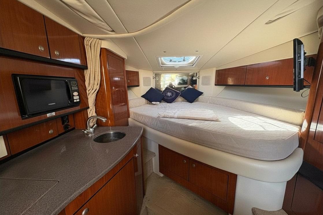 Angetrieben wird die Sea Ray 335 Sundancer von zwei leistungsstarken Dieselmotoren, die souveräne Fahrleistungen ermöglichen. Mit einer Reisegeschwindigkeit im Bereich von etwa 22 bis 26 Knoten und einer Höchstgeschwindigkeit von rund 30 Knoten überzeugt das Boot durch ein sicheres, stabiles und zugleich dynamisches Fahrverhalten. Die Manövrierbarkeit ist für diese Größe bemerkenswert unkompliziert, was sowohl Einsteigern als auch erfahrenen Skippern entgegenkommt.