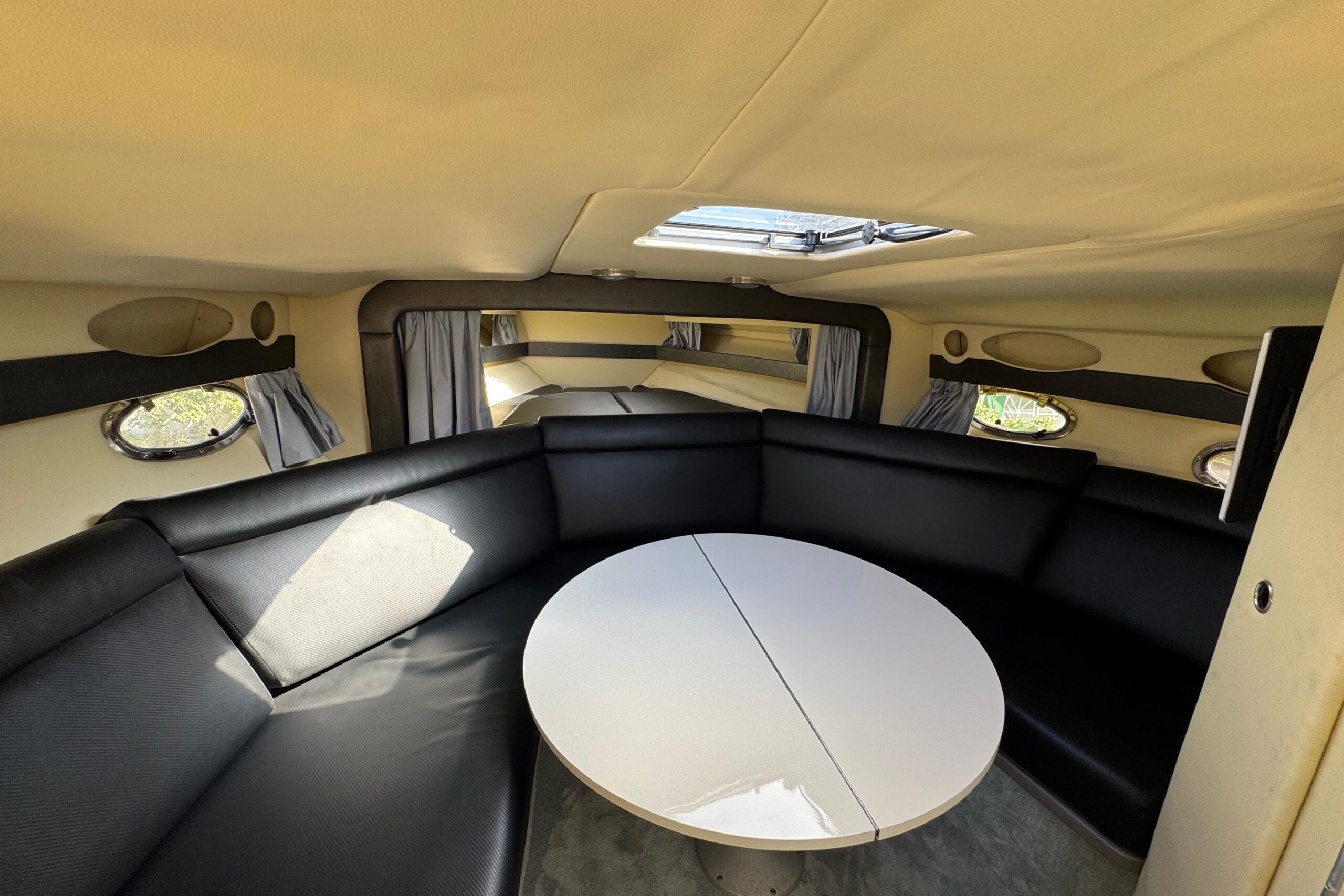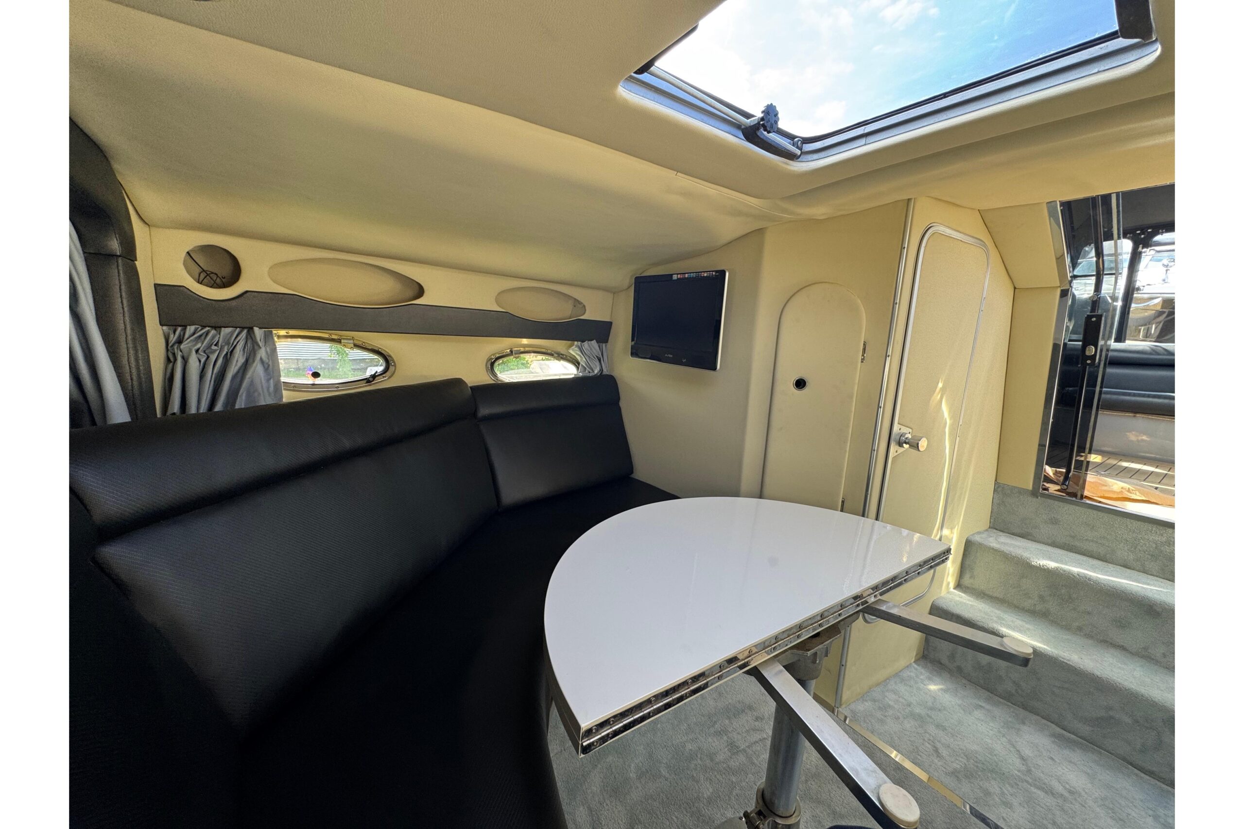 Die Sunseeker Tomahawk 37 kombiniert sportliche Linienführung mit britischer Werftqualität. Der V-Rumpf sorgt für hervorragende Laufeigenschaften auch bei rauerer See, während der großzügige Cockpitbereich ausreichend Platz zum Entspannen bietet. Die Kabine ist funktional ausgestattet und bietet Komfort für Übernachtungen an Bord.